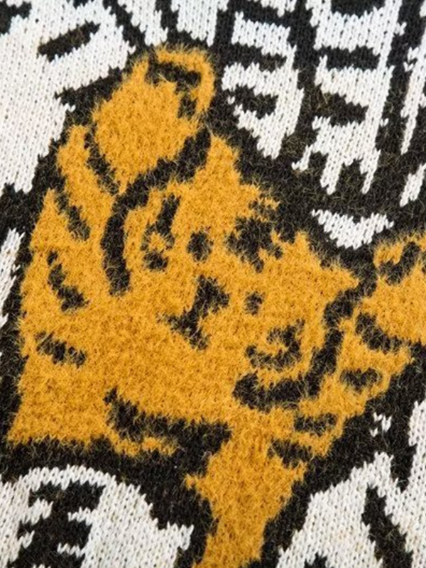 >Descripción: Dale sabor a algunos suéteres de tigre de dibujos animados para los meses restantes del año 2022. Estos suéteres tienen motivos de tigre de dibujos animados en todo el cuerpo, hombros caídos y ribetes acanalados en el cuello, los puños y el dobladillo.